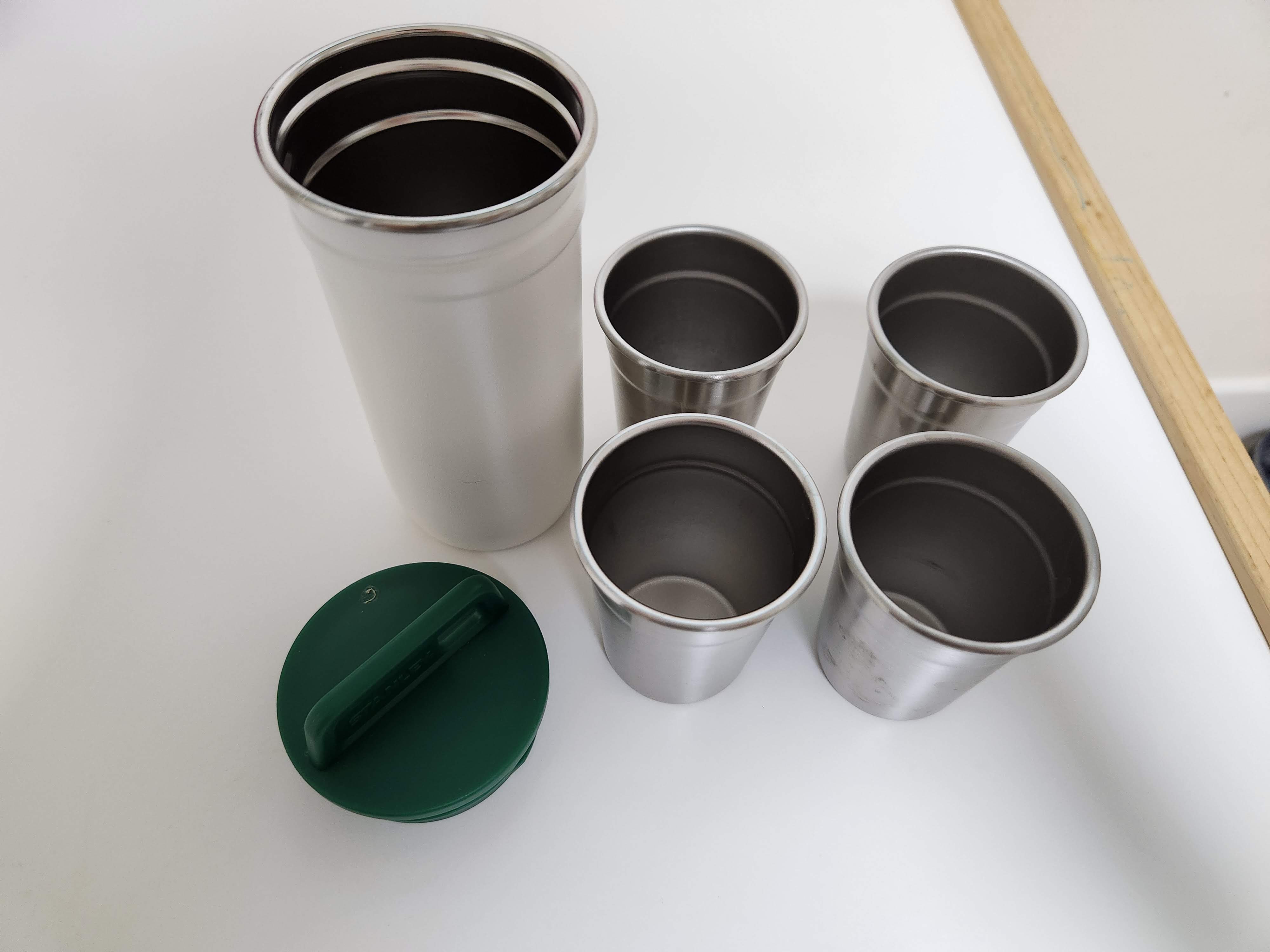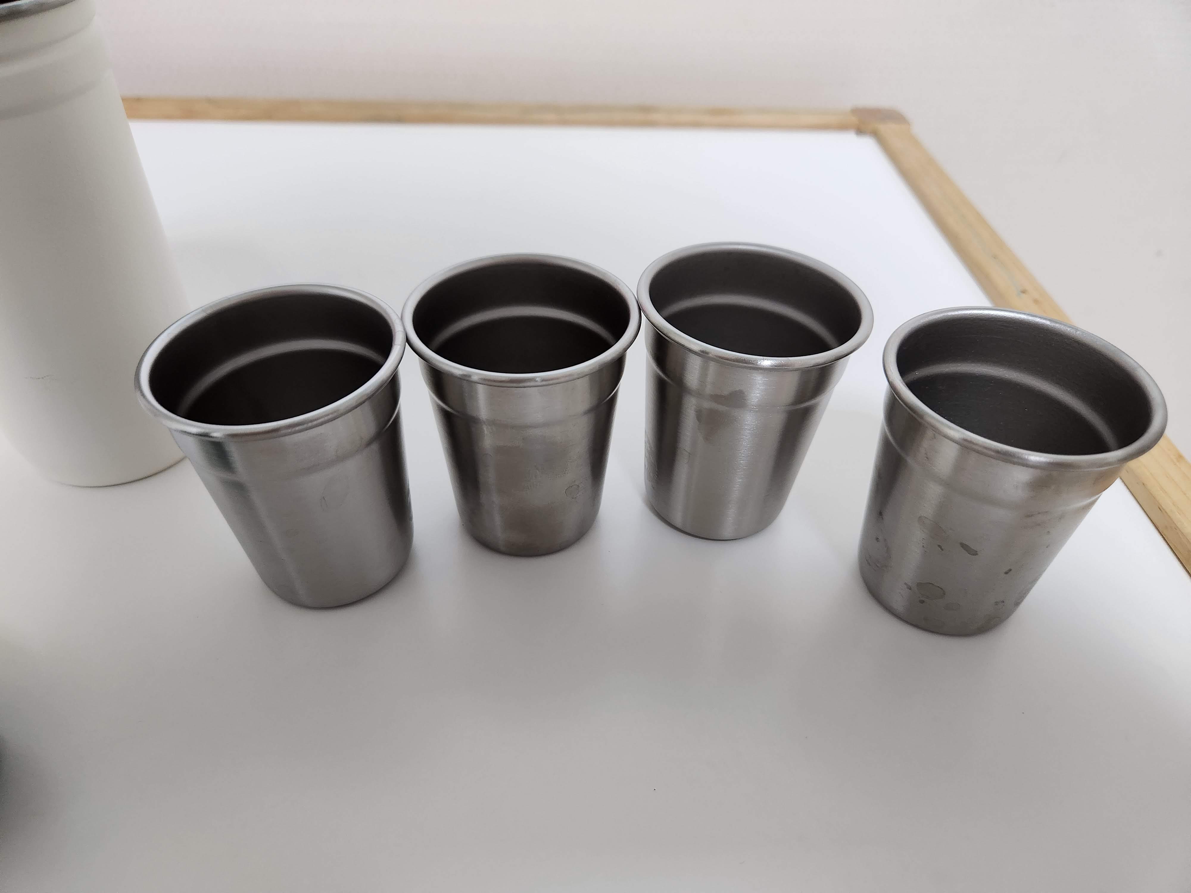 소주잔 4개와 보관함 케이스 1개로 구성되어 있다. 재질은 스태인리스로 저렴해보이지 않는 재질이다. 더구나 4잔으로 구성되어 있어 4인가족 또는 솔캠에서 사용하기 충분하다.