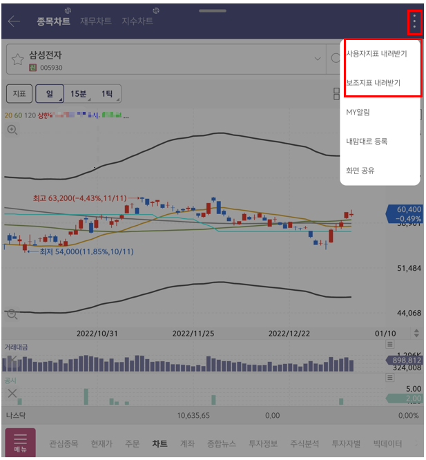 3) '사용자지표', '보조지표' 내려받기를 선택한다