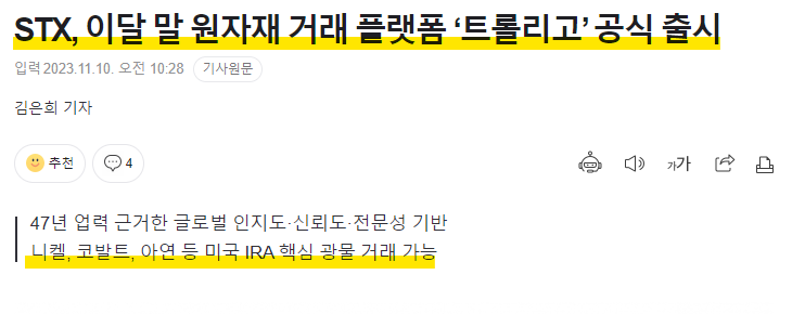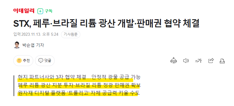 뉴스의 핵심은 핵심광물 공급계약 체결 + 온라인 판매 플랫폼 구축이다. 결국 이 두가지 시너즈가 얼마나 빠른 매출성장을 보여줄 것인지 STX를 지속관찰하며 그 흐름을 보며 투자아이디어를 갖는것도 나쁘지 않을것같다.