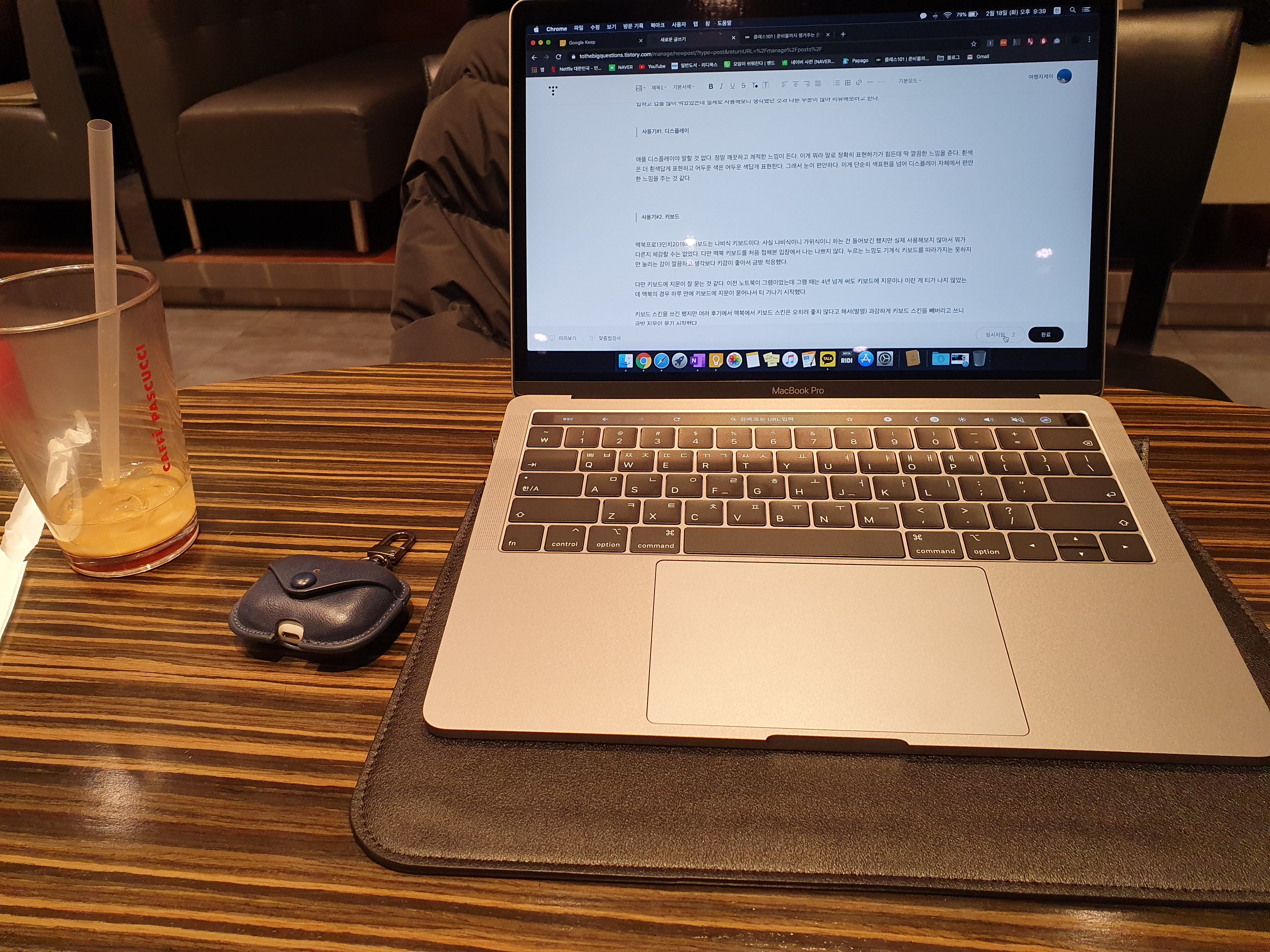 다만 키보드에 지문이 잘 묻는 것 같다. 이전 노트북이 그램이었는데 그램 때는 4년 넘게 써도 키보드에 지문이나 이런 게 티가 나지 않았는데 맥북의 경우 하루 만에 키보드에 지문이 묻어나서 티 가나기 시작했다.