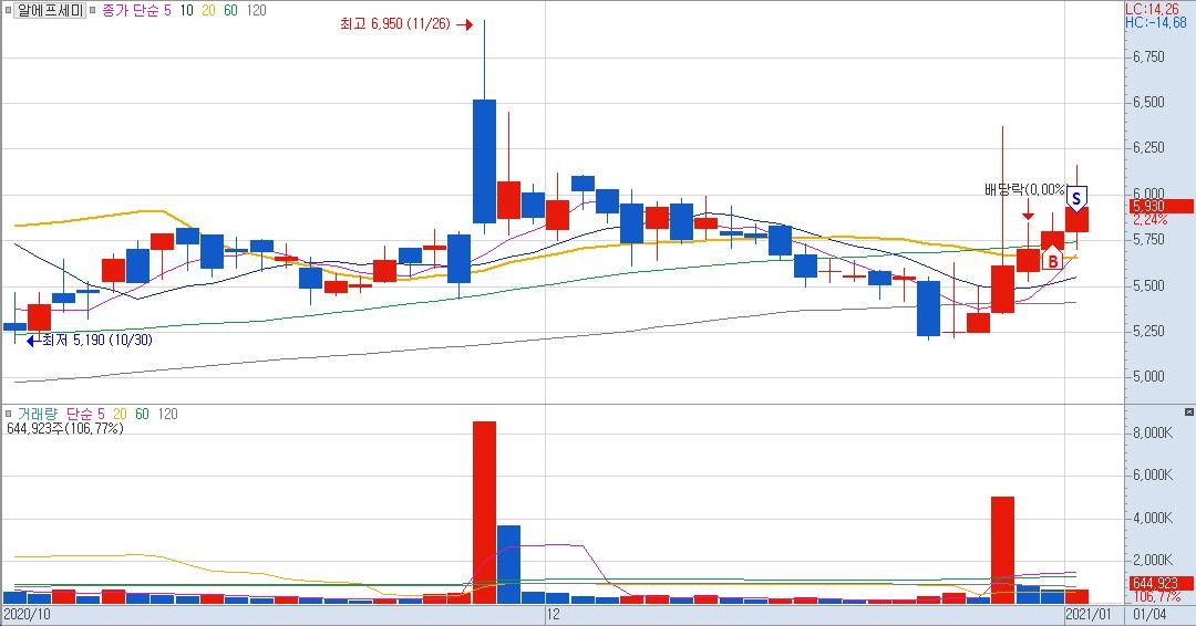 매수 : 5일선이 20일선을 돌파하고 20일선의 지지를 받아 상승 추세로 전환할것같다고 판단하여 매매