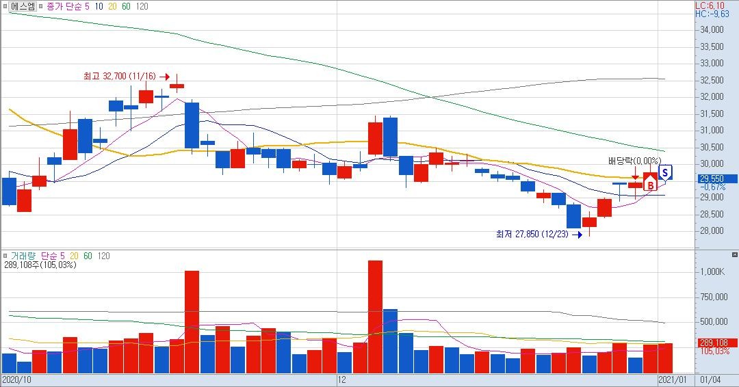 매도 : 최초 매수 근거였던 20일선 지지가 무너지면서 지속적 하락발생으로 단기이평선(5일선)이탈 전 매도