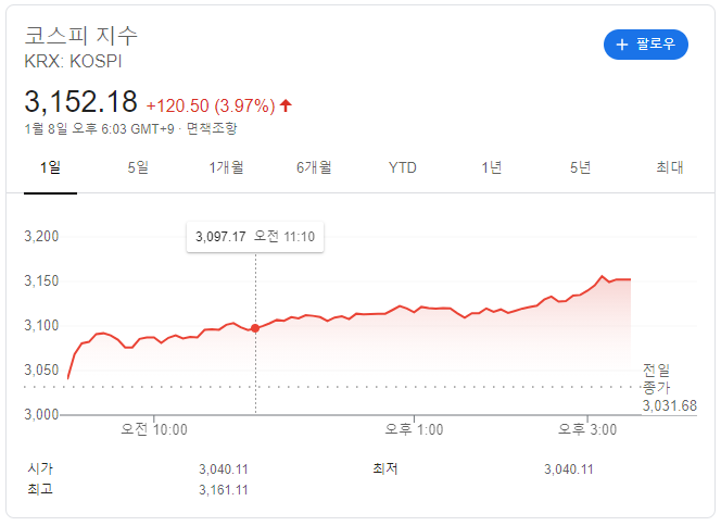 한국의 주식의 가치를 가장 잘보여주는 코스피만 봐도 10년간 박스권에서 놀던 코스피가 3000을 돌파했고 3000을 돌파한지 일주일도 되지 않아 3100을 넘어 3500을 향해 가고 있는 모양이다.