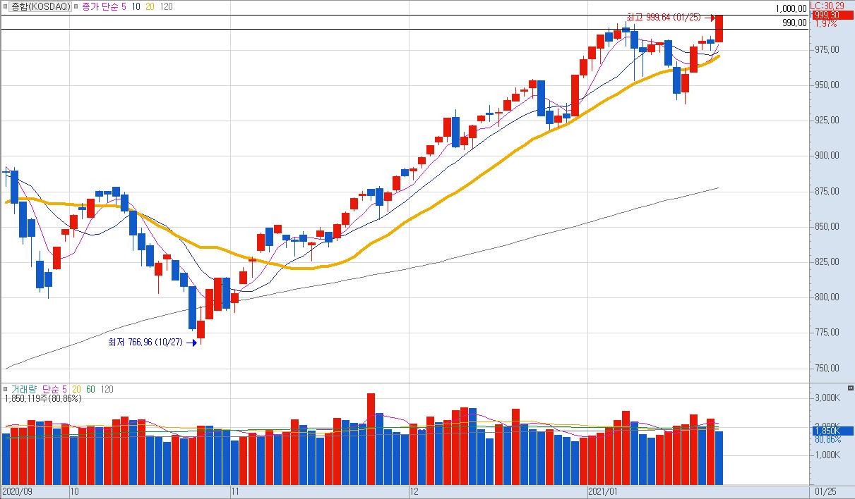 코스닥은 1000포인트를 바로 눈앞에두고 999에 마감했다. 이 추세라면 코스피 3000돌파와 비슷하게 강하게 상승이 나오고 조정 또는 추가 반등이 나올것같다. 990을 기점으로 대응하는것이 중요할것같다. 990을 이탈한다면 20일선 지지를 받는지 아니면 지속 하락할지 지켜봐야할것같다.