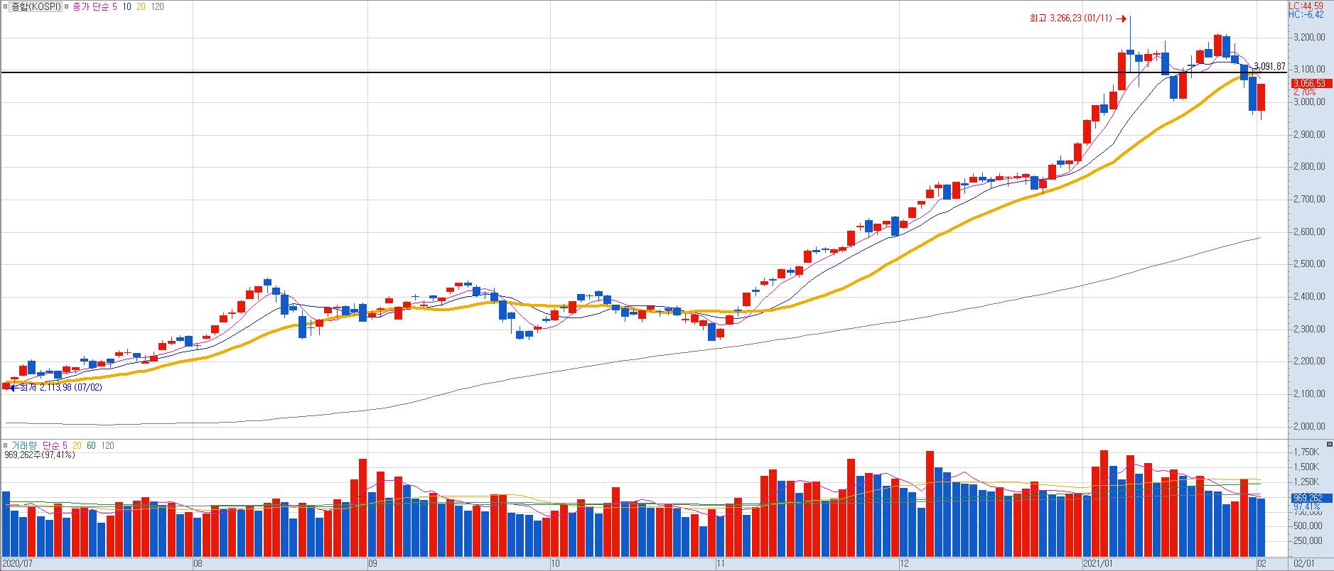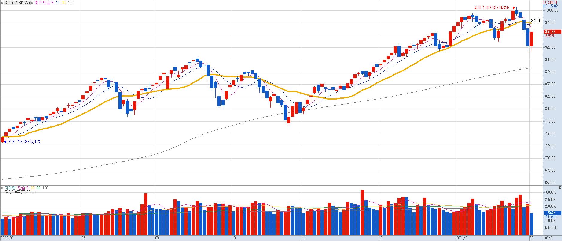 지난주 금요일(1/29) 지수가 무너지면서 급락이 나왔다. 그리고 미국증시도 회복하지 못하고 하락마감하여 오늘 장도 하락을 예상하고 접근했으나, 언제 그랬냐는 듯이 급반등이 나왔고 금요일 하락폭을 80% 이상 채우며 회복에 성공했다.