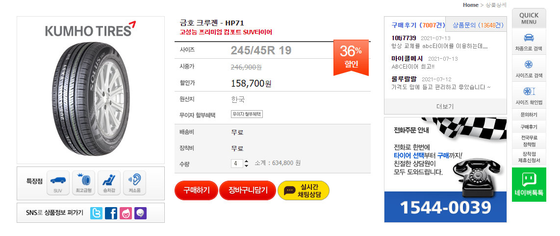 *Tip. 금호 HP71 선택이유 : 노면 소음과 내구성 그리고 다양한 후기로 인해 가격이 싼편은 아니지만 선택함