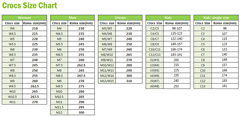 크록스는 남자, 여자 같이 비교하며 사이즈가 나오므로 꼭 표를 확인하고 구매를 진행하자.