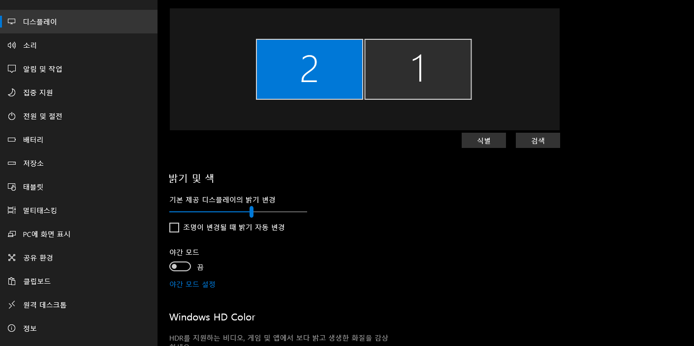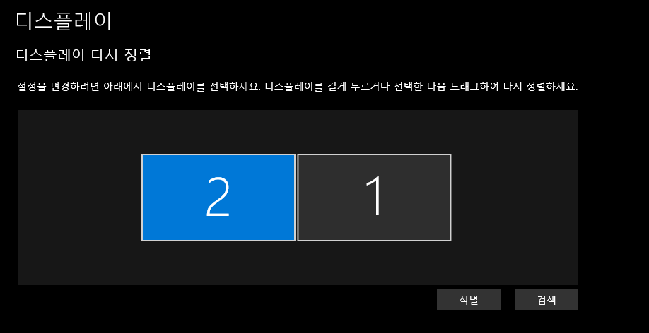 Tip. 어떤 화면이 번호와 일치하는지를 확인하기 위해서는 우측 하단에 있는 "식별"을 클릭하면 모니터 왼쪽 하단에 번호가 뜬다. 그 번호를 확인하면 어떤 모니터가 표시되는지 확인할 수 있다.