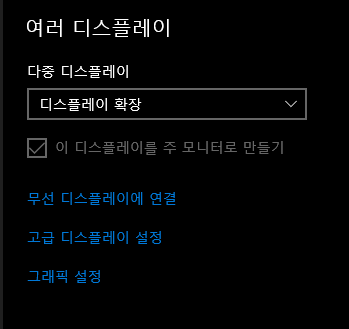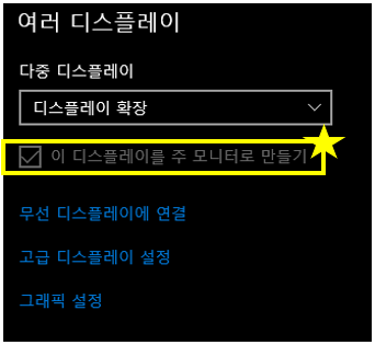 : 메인 모니터로 쓸 화면을 선택한후 아래 보이는 "이 디스플레이를 주 모니터로 만들기"를 확인해야 모든 화면이 메인 모니터 위주로 뜨게 된다.